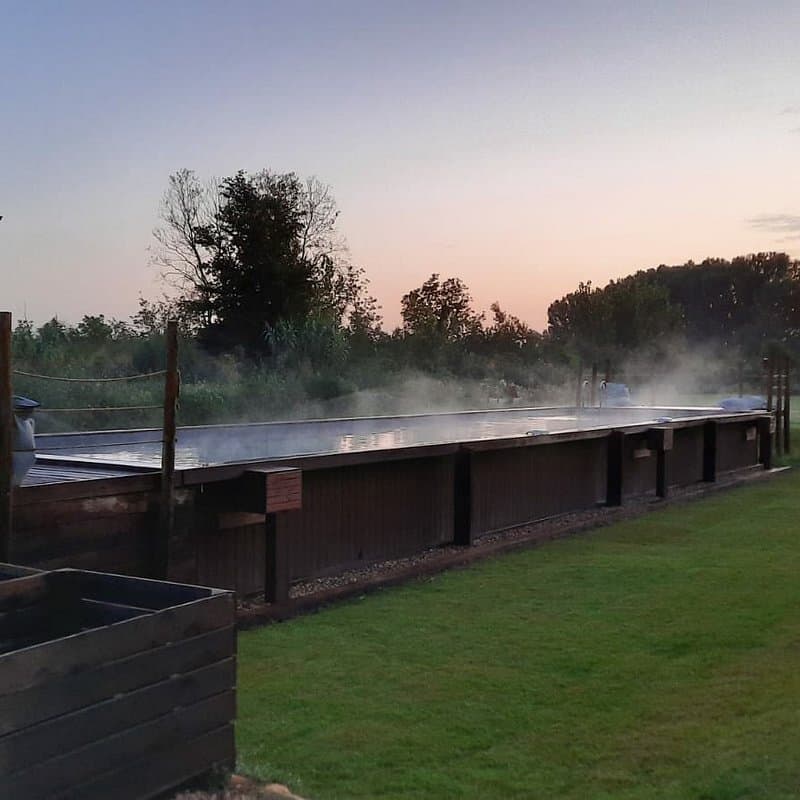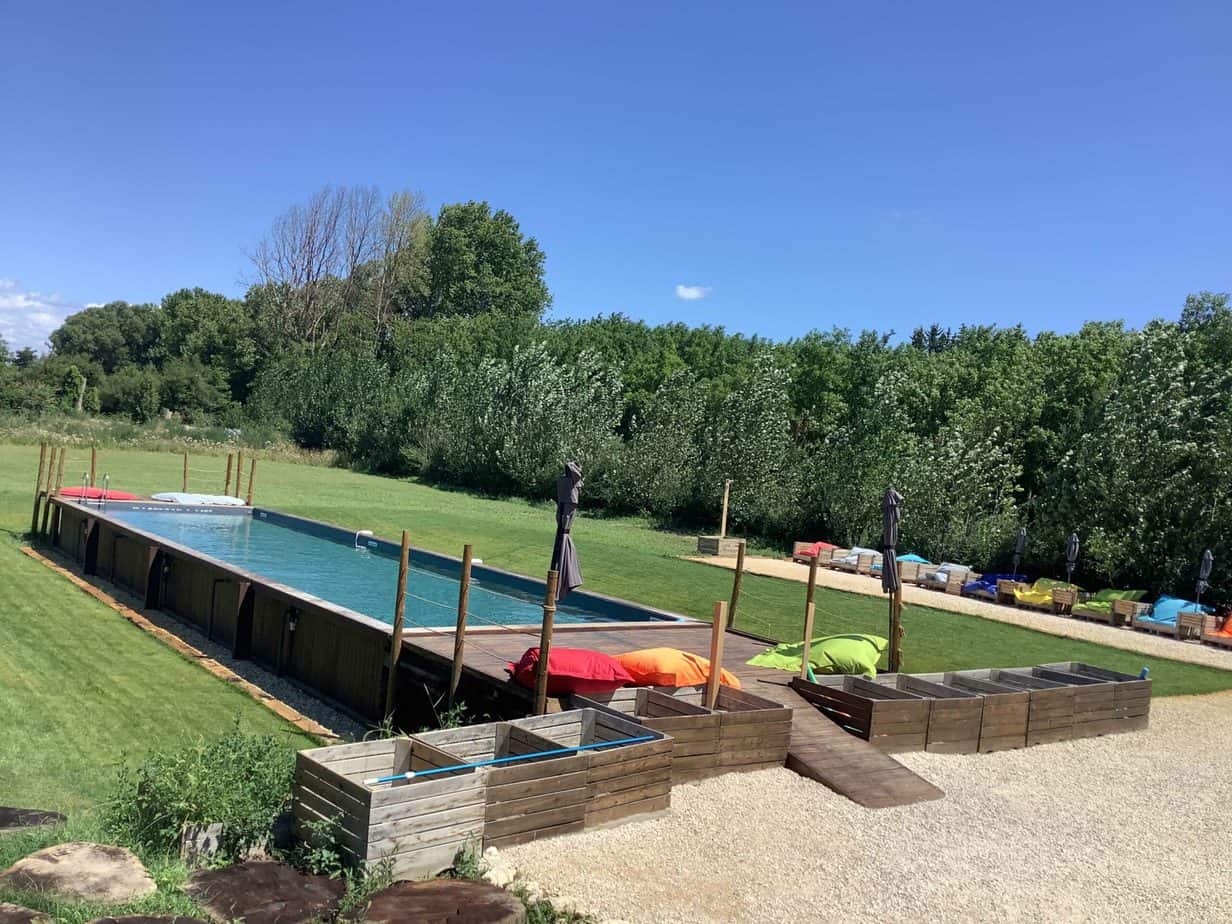 La piscine est en bois, et semi enterrée. Elle fait 20 mètres de long et 5 mètres de large.Autour de vous, de grands arbres, le mas, le jardin et le Mont-Ventoux en toile de fond, un cadre enchanteur et champêtre qui saura plaîre à tous. La grande terrasse gazonnée sera l’endroit parfait pour s’allonger au soleil sur nos gros poufs ultra confort, que vous pourrez positionner à votre aise. Des sièges cosy en bois accompagnent cet espace où le mot d’ordre est Farniente !